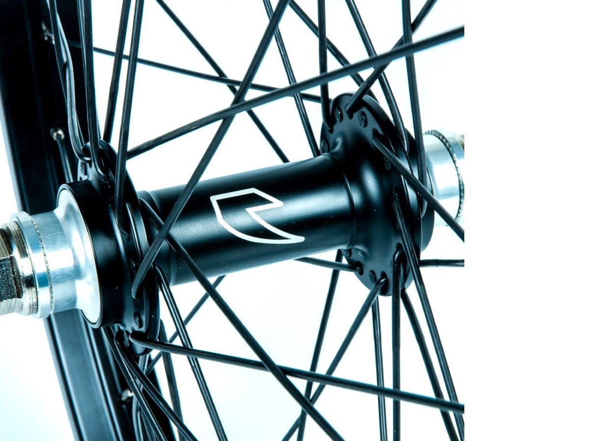 The new Air rims are laced in a 3 cross configuration using double butted spokes on to a Glide front hub for one of the strongest & lightest wheels available. These are Chrome rims laced onto black hubs using Black spokes.